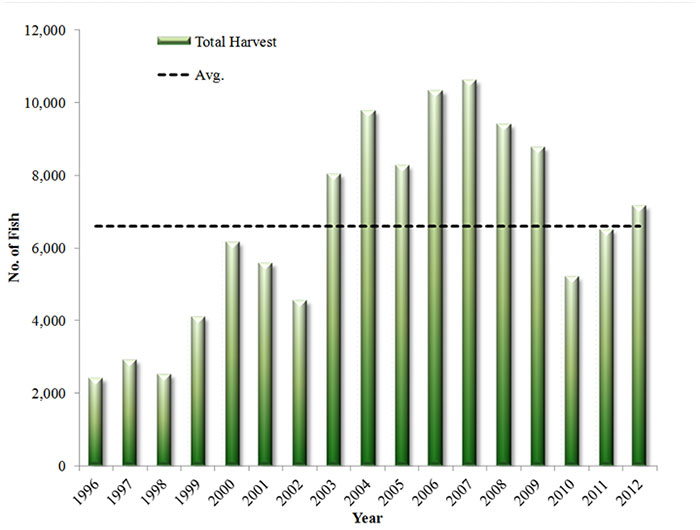 Assessment of run strength of Karluk River Chinook salmon is conducted with a weir located about ¼ mile upstream of Karluk Lagoon. Annual run size of Karluk River Chinook salmon is typically around 9,000 fish. Karluk River Chinook salmon have an escapement goal of 3,000 to 6,000 fish and since 1985 escapements have averaged about 8,000 fish. However, in the past 10 years escapements have averaged just over 3,000 fish and have failed to attain the lower bound of the escapement goal in 5 of the past 10 years (Figure 2). Spawning occurs from August through September and very few Chinook salmon are known to enter Karluk Lake or its tributaries. Beginning in 2014, in conjunction with ongoing weir operations, information on the age, sex, and length of Karluk River Chinook salmon will be gathered.
