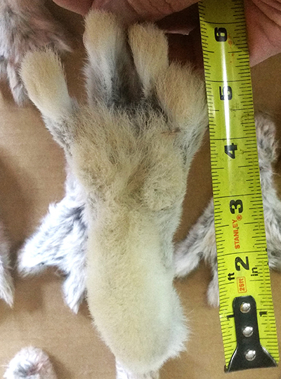 Right: The bottom of a snowshoe hare's foot, showing the hair on the footpad that is visible in the silty track. Only the front half appears in that track, the heel did not touch the ground. It's more likely to show up in snow, which is why the hare's track would look bigger (longer) in snow.