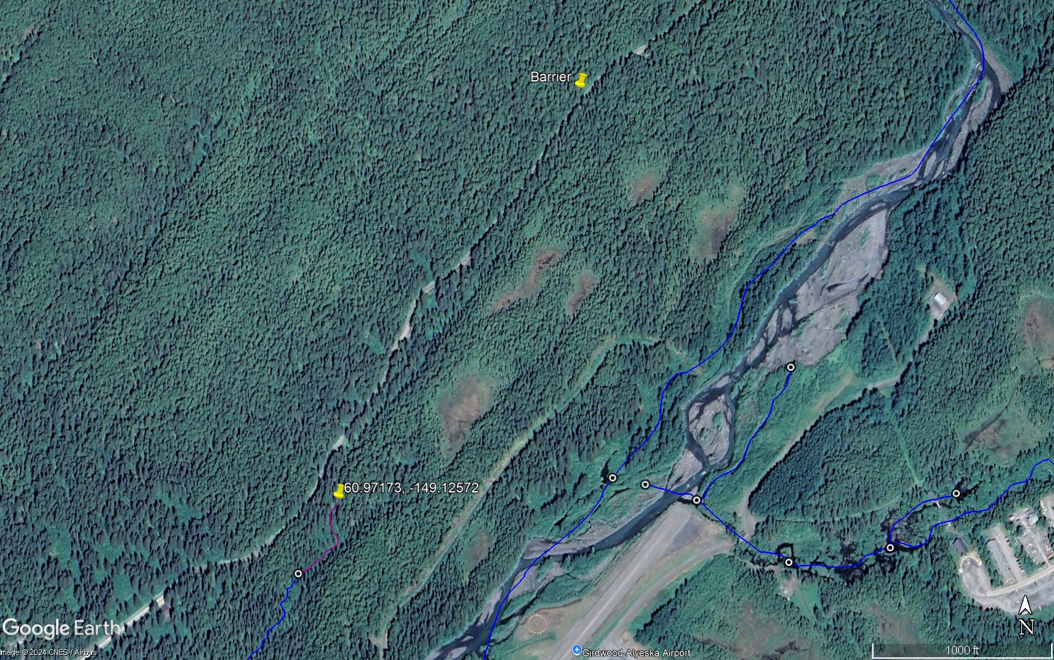 Comments: I used three baited minnow traps and captured 4 juvenile coho salmon upstream of the specified reach at 60.97173, -149.12572. Good quality rearing habitat is located upstream of the captured coho salmon. I captured about 10 adult and juvenile resident Dolly Varden upstream from the captured coho to a 4-foot high barrier located at 60.97796, -149.11818.