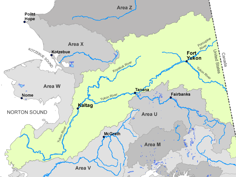 All Yukon River drainages (including the Alaska portion of the White River drainage but excluding the Tanana River drainage), from the south side of the Brooks Range to the Bering Sea; and from the Canadian border to the Bering Sea; and all drainages of the Koyukuk River and Alatna rivers.
