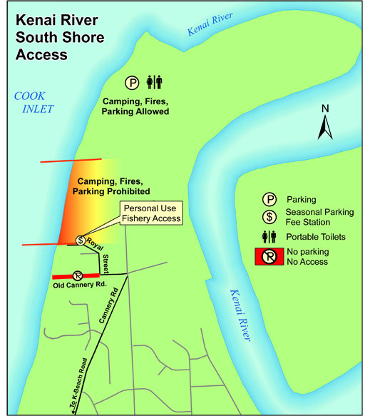 The City of Kenai has provided a large day-use parking area and limited overnight RV camping at the end of South Spruce Street. Parking & camping spots are marked. The City of Kenai charges fees for parking and for camping. Tow trucks make regular visits to the area.