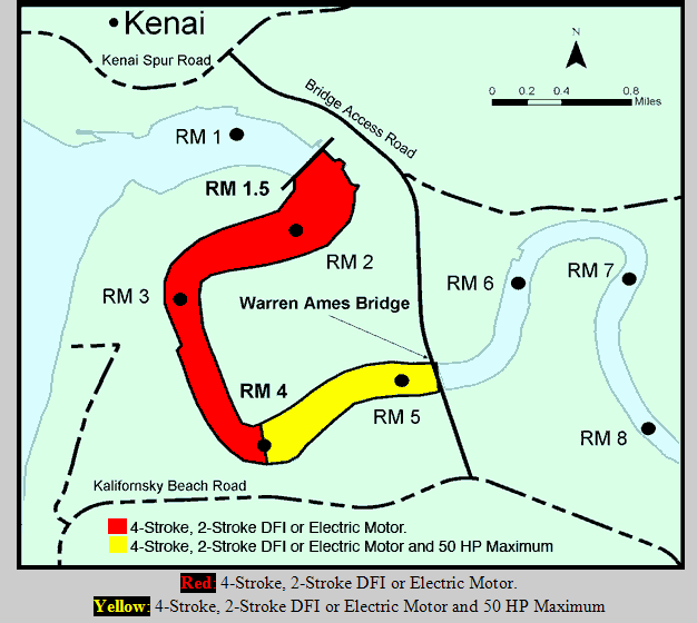 This regulation prohibits the use of two-stroke motors in the personal use dip net fishery, which occurs in the Lower Kenai River in July. This regulation was adopted by the Alaska Board of Fisheries during their February 2008 Upper Cook Inlet meeting. Water quality sampling over the last 7 years has consistently shown that hydrocarbons originating from gasoline-burning engines have far-exceeded state standards during the busiest days on the Kenai River in July. These repeated high levels of hydrocarbons led the Alaska Department of Environmental Conservation (ADEC) to declare the lower 19 miles of the Kenai River as "impaired". This required the state to take action to alleviate the pollution.
