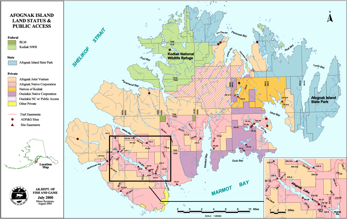 This page depicts the most current land status for Afognak Island and describes all available public access easements.