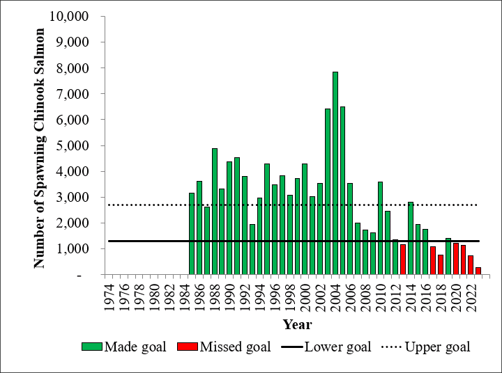 Assessment of run strength of Chignik River Chinook salmon is conducted with a weir located about halfway between Chignik Lagoon and Chignik Lake. All subsistence and commercial inshore harvests are directly reported and sport harvest is estimated by a survey. Annual run size of Chignik River Chinook salmon is typically around 5,500 fish. Chignik River Chinook salmon have an escapement goal of 1,300 to 2,700 fish and since 1985 escapements have averaged about 3,300 fish. Beginning in 2014, in conjunction with ongoing weir operations, information on the age, sex, and length of Chignik River Chinook salmon has been gathered.