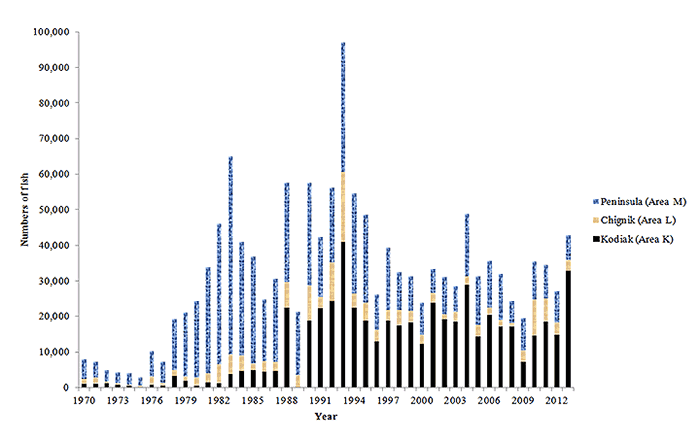 Assessment of run strength of Karluk River Chinook salmon is conducted with a weir located about ¼ mile upstream of Karluk Lagoon. Annual run size of Karluk River Chinook salmon is typically around 9,000 fish. Karluk River Chinook salmon have an escapement goal of 3,000 to 6,000 fish and since 1985 escapements have averaged about 8,000 fish. However, in the past 10 years escapements have averaged just over 3,000 fish and have failed to attain the lower bound of the escapement goal in 5 of the past 10 years (Figure 2). Spawning occurs from August through September and very few Chinook salmon are known to enter Karluk Lake or its tributaries. Beginning in 2014, in conjunction with ongoing weir operations, information on the age, sex, and length of Karluk River Chinook salmon will be gathered.