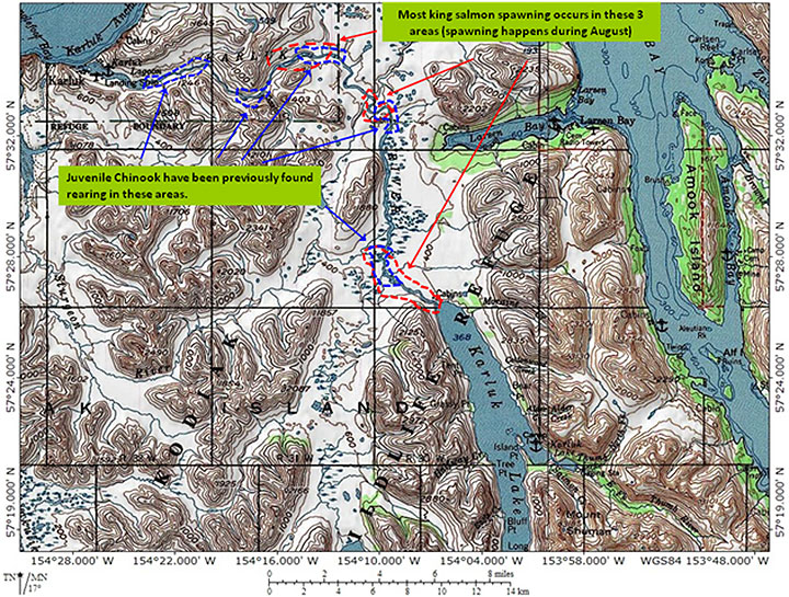Smolt abundance studies on Karluk River Chinook have not been conducted previously at large scales. One previous study was a trapping survey of the drainage from Karluk Lake to Karluk Lagoon that sought to document rearing habitat used by juvenile Chinook and estimate their abundance. The study identified the lower Karluk River, below the portage, as the primary rearing area for Chinook, but few Chinook were captured and results were somewhat inconclusive. A small scale study using radio telemetry was conducted in 2012 on Karluk Chinook returning to spawn and indicated that the primary spawning habitat was in the lower river near an area around Shasta Creek.