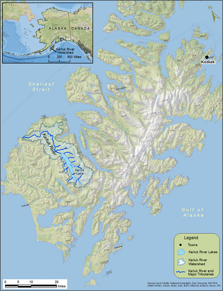 In the Kodiak Area, Chinook salmon are present in 7 known streams. The Karluk River is located on the southwest end of Kodiak Island and supports 1 of only 2 native stocks of Chinook salmon on the Kodiak Archipelago. From its source at the outlet of Karluk Lake, the Karluk River flows 22 miles to its terminus at Karluk Lagoon. Freshwater entry of Chinook salmon occurs during late may through mid-July with 50% of the run typically over by mid-June. All subsistence and commercial inshore harvests are directly reported and sport harvest is estimated by a survey. Karluk River Chinook salmon are harvested incidentally to directed sockeye, pink, chum, and coho salmon commercial fisheries within the Westward Region.