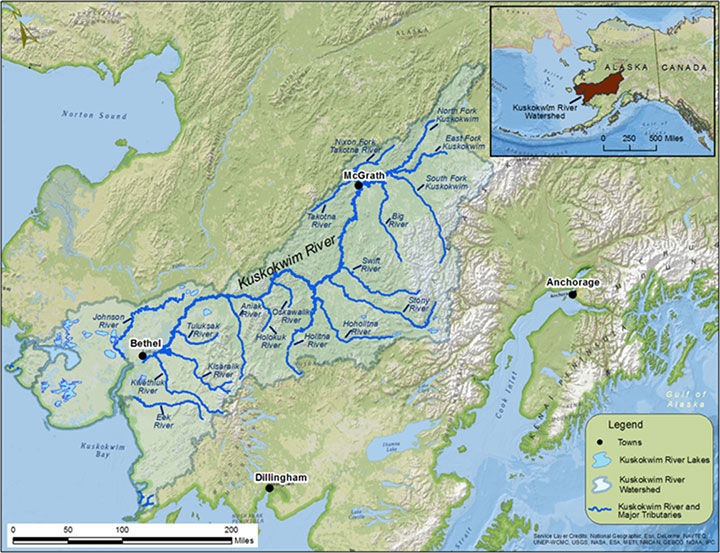 The Kuskokwim River is the second largest river in Alaska, draining an area approximately 130,000 km2, (approximately 50,200 square miles) which represents 11% of the total area of Alaska. Adult Chinook salmon returning to the Kuskokwim River historically supported subsistence, commercial, and sport fisheries, in which annual harvests were 60,000 to 160,000 fish. The Chinook salmon subsistence fishery in the Kuskokwim Area is the largest in the state and remains a fundamental component of local culture (Brazil et al. 2011). The Kuskokwim River also had a lucrative commercial fishery for Chinook salmon through the early 1990s but directed commercial fishing for Chinook salmon ended in 1987. Since 1976, total Chinook salmon harvest from subsistence, commercial, and sport fisheries has resulted in exploitation rates ranging from a high of 62% in 1988 to a low of 13% in 2015 and 2017. Below average run sizes in recent years have resulted in restrictions to fishing opportunity and failure to meet some escapement goals.