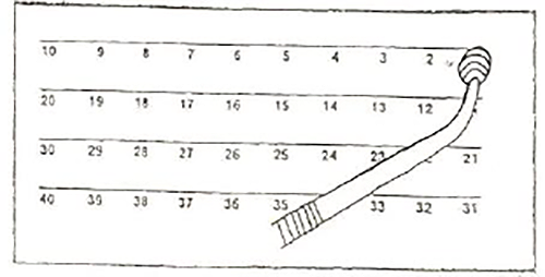 On the acetate, scale position corresponding to the first fish should be labeled with a "one" written on the acetate and a line should be drawn between the scales from the fifth and sixth fish. These written markers help quickly identify the position on the acetate and prevent data entry errors. Use a fine-tip permanent marker to label the acetate.