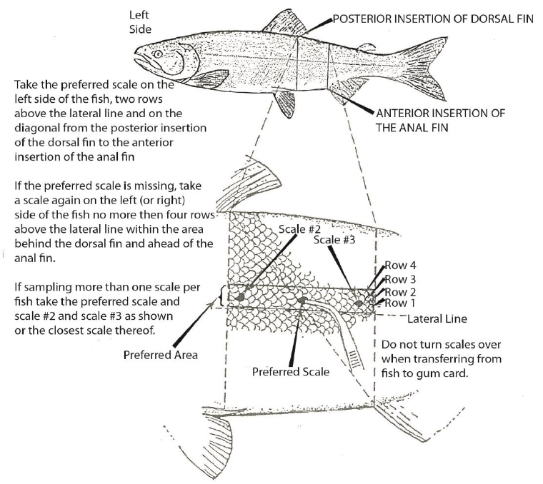 The preferred sampling location on the body of a fish is within three scale rows above the lateral line and between the posterior insertion of the dorsal fin and anterior insertion of the anal fin on the left side of the fish (Figure 1; Mosher 1963; Scarnecchia 1979). If scales are not present in the preferred area, alternative scales should be taken in the following order: