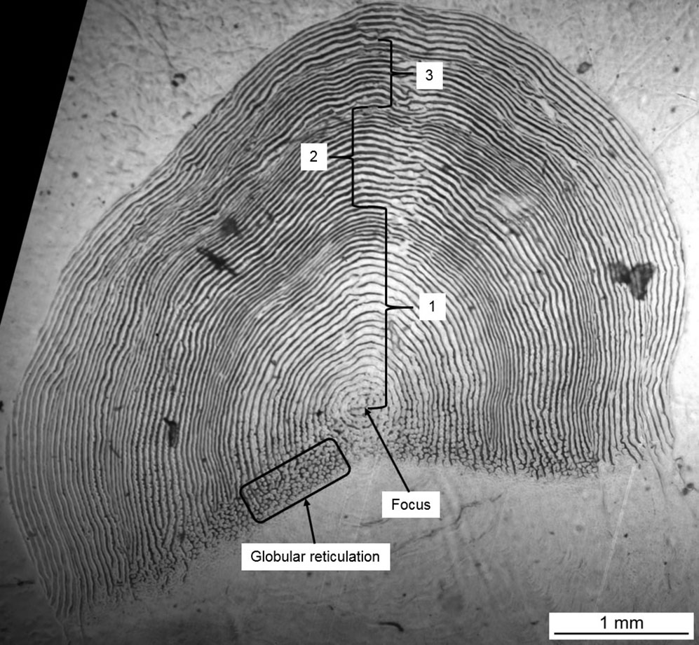 Chum salmon (Oncorhynchus keta) scales lack freshwater annuli and commonly have three or four ocean annuli (Figure 1). Reticulation, a network of scale material at the base of the scale, is globular in shape and has less than seven and generally few to no complete circuli below the focus (Bilton et al. 1964; Mosher 1969).