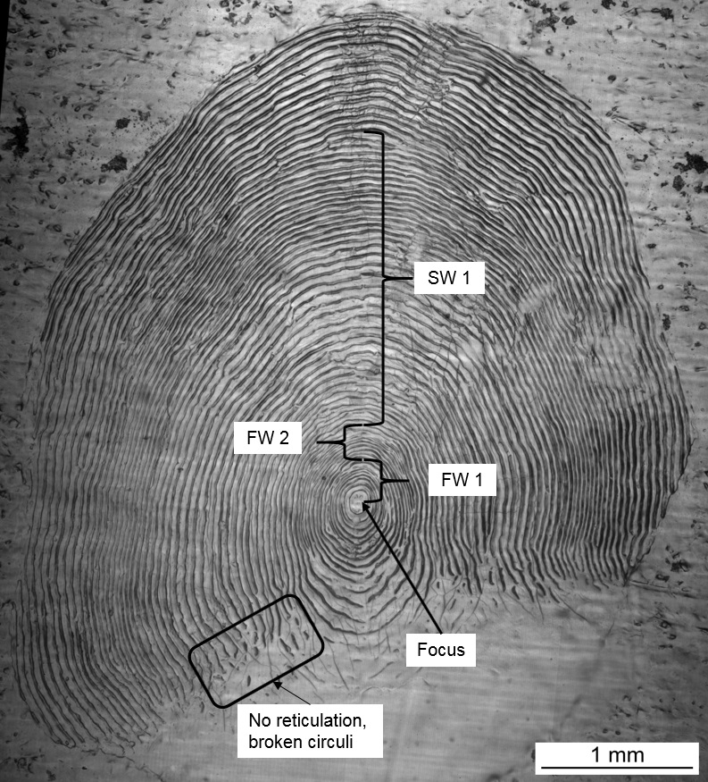 Alaska steelhead scales commonly have two to four freshwater annuli and one to several ocean annuli, reflecting dominant age classes (Figure 5). Stress checks may be present on steelhead scales as bands of reabsorbed or disrupted circuli associated with energetically stressful events or spawning.