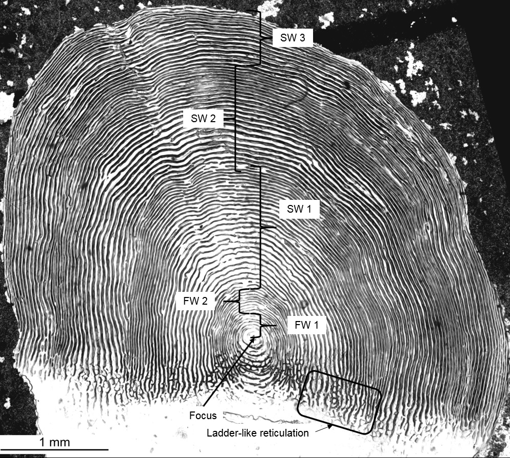 Coho salmon (O. kisutch) scales are generally large for the size of the fish. They usually have one or two freshwater annuli, although scales with three annuli may occur (Figure 4). Coho salmon typically spend one year in the ocean. Similar to Chinook salmon, coho salmon scales have little to no reticulation but show many complete and broken circuli posterior to the scale focus. The circuli are fairly distinct, and there are generally >10 complete circuli below the focus (Bilton et al. 1964; Mosher 1969). The posterior field has strong radial striations. Circuli pinch in strongly at the dorsal and ventral ends of the base of the scale.