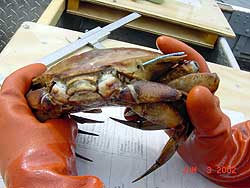 An ADF&G biologist was stationed onboard the charter vessel to count and sample the catch. Daily, set locations, and set and pull times were recorded for all or a subsample of pots and the contents of the pot recorded. The Dungeness crabs were measured, shell condition, leg condition and reproductive status of the females was determined, if time permitted. Bycatch species were also counted and recorded for each pot. All crabs were returned to the water after sampling.