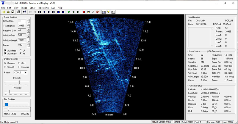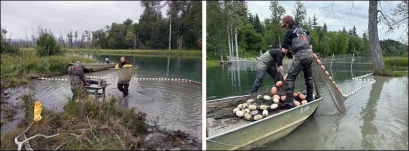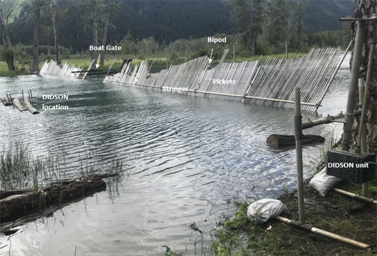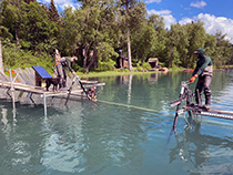 The weir is an aluminum and steel bipod structure approximately 33 meters long with a 4.3 meter opening at the center where a removable gate is installed to allow both fish and boat passage (Figures 6 and 7). The weir's unusually deep and wide opening are best monitored in tandem with a DIDSON Sonar placed upriver of the weir. The DIDSON recordings are interpreted daily allowing for inseason monitoring of the sockeye salmon run (Figure 8). The gate is shut at night to prevent fish passage so salmon can be sampled first thing each morning by beach seine (Figure 9 and 10). Age, sex, and length (ASL) data are collected daily to determine the age composition.
