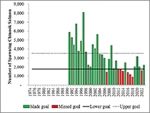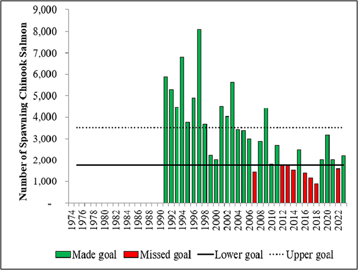 In 1981, a biological escapement goal was set at 2,000 large fish based on an assumed fraction of the total escapement represented by survey counts. Biological escapement goals are determined by the Alaska Department of Fish and Game (ADF&G) based on the number of salmon that need to escape to spawn to produce sustained yields into the future. Ericksen and McPherson (2004) recommended a revised biological escapement goal range of 1,750 to 3,500 large Chinook salmon based on information gathered from the mark-recapture studies along with limited juvenile tagging results. This goal range was reviewed and adopted by ADF&G in 2003, and subsequently reviewed and accepted by the Chinook Technical Committee of the Pacific Salmon Commission in 2004.