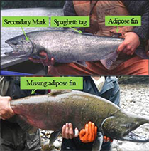 Mark-recapture studies in the Chilkat River drainage have been conducted by ADF&G every year since 1991. Abundance has ranged from 875 to 8,100 large fish and averaged 3,200 large fish from 1991 to 2023. During June and July, drift gillnets (and fish wheels prior to 2024) are used to capture returning adult Chilkat River Chinook salmon. Drift gillnets are operated consistently in a 3 km (2 mile) stretch of the lower Chilkat River, which also contained the location of two Chilkat River fish wheels prior to 2024 when that project ended. Once captured, the adult salmon are sampled for age, sex, and length information, and they are checked for the presence or absence of an adipose fin. Fish missing their adipose fin are additionally sampled for the presence of coded wire tags that would have been applied to fish during their juvenile life stage (see Juvenile Abundance below). Sampled fish are then tagged with an external spaghetti tag and given two secondary marks to mediate against tag loss (Figure 3).