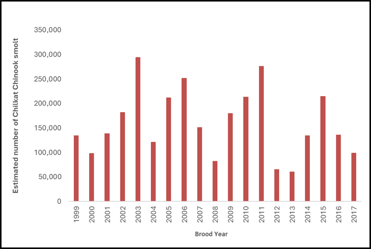 Studies to estimate the abundance of juvenile Chinook salmon in the Chilkat River drainage have been performed by ADF&G annually since 1999. Juvenile Chinook salmon from the same parent year are marked with adipose fin clips and tagged with coded wire tags during September and October, and again April and May as smolt before they emigrate to sea. Tagging in the fall and spring greatly increases the total number of tagged fish leaving the Chilkat River. On average, over 23,000 fall juveniles and 4,000 spring smolt have been tagged each year and smolt abundance has ranged from 60,000 to 290,000 since 1999 (Figure 4).