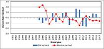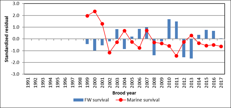 Freshwater survival (egg-to-smolt) can be estimated by assessing how many smolt are produced from each spawner. In most years freshwater survival has been close to average. The 2012 and 2013 parent years were the lowest in the time series, however, freshwater survival rates have since rebounded (Figure 5). Marine survival (smolt-to-adult) has ranged from 0.8% to 4.6% and averaged 2.5% for the time series, including parent years 1999 to 2017 (Figure 5).