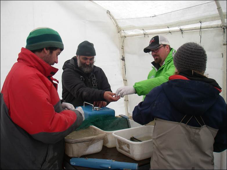 Fall fingerlings and spring smolt are primarily captured using minnow traps baited with disinfected salmon eggs. After juveniles are captured, they are transported back to camp and anesthetized, marked, tagged, and held for 24 hours to assess retention of coded wire tags and ensure they are healthy prior to release (Figure 7).