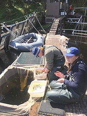 The season begins with the installation of a smolt weir with the primary goals of estimating outmigrating abundance of sockeye and coho salmon smolt, and implanting coho salmon with CWTs that allow biologists to determine the productivity and harvest of Hugh Smith Lake coho salmon. Each CWT is approximately 1 millimeters long and contains microscopic numbers to link the tag to the location and year it was implanted. The smolt weir has been operated annually since 1982 from late April to early June with few exceptions. The weir is made of eight mesh covered panels with mesh wings designed to span the channel which funnels smolt into an inclined-plane trap (Figures 9 and 10). The trap is checked for catch every 3 to 12 hours and captured fish are sorted by species and enumerated (Figure 11). In addition to sockeye and coho salmon, other species are observed at the weir including rainbow trout, cutthroat trout, Dolly Varden, pink salmon fry, and adult steelhead.