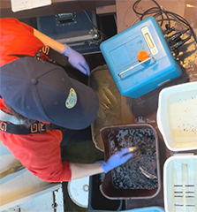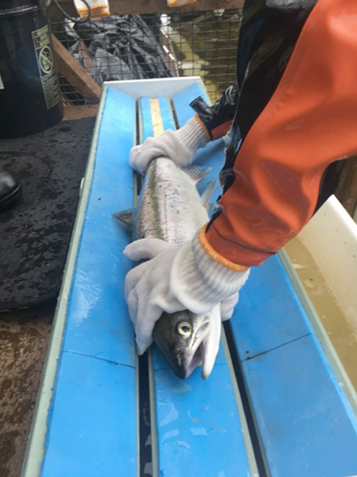 If an adipose-clipped coho salmon has a dorsal tag, a suspected half-length snout tag, or no snout tag, it is likely a known-age sample and therefore very valuable to help determine ages. All suspected known-age adult coho are sacrificed, sexed, measured for length, and 10 very valuable scales are collected. The head containing the CWT is labeled and submitted to the ADF&G Mark, Tag and Age Laboratory so that they can extract and read the tag code to determine the date and location the tag was implanted.