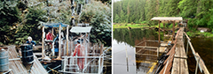 An adult weir has been operated annually at Hugh Smith Lake since 1980 to enumerate returning adult salmon and determine if the escapement goals were met. The Hugh Smith Lake weir is an aluminum bipod, channel-and-picket weir with an upstream trap for counting and sampling salmon (Figures 15). It is located at the outlet of the lake, approximately 50 meters from the saltwater. Generally, the weir is installed shortly after the smolt weir is removed and operates from mid-June through early November with few exceptions. A gate on the upstream side of the weir trap allows the crew to visually identify fish to species and count them as they swim unimpeded into the lake, or conversely drop the gate to trap and sample fish in the trap box as needed (Figures 16 and 17).