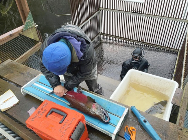 Additional sockeye and coho salmon sampling occur at both the spawning streams and the weir. Age, sex, and length data are collected from a subset of returning sockeye and coho salmon (Figures 20 and 21), based on each species' run timing, to determine the age composition of the escapement and monitor trends in fish size at age. A portion of sockeye salmon and all coho salmon are marked externally with a fin clip (Figure 22). All coho salmon are also examined for the presence of an adipose fin and CWT (Figure 23).