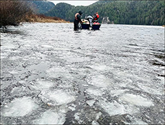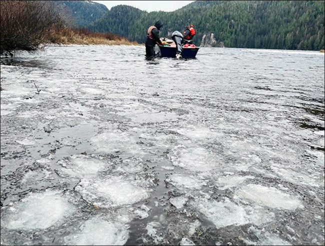 The Hugh Smith Lake field camp is up and running for most of the year. We get camp started up in spring, sometimes before the ice melts off the lake, and crew are often on site late enough in the season to see the first snow of fall (Figures 3–5). The staff and weekly supplies are predominantly brought in by float plane, but the lake is also accessible by boat and a short tide-dependent walk up the saltwater trail (Figures 6–8). Generally, a two-person team is on site to perform the various fieldwork required, and additional crew are used to install and demobilize camp and weir structures, or occasionally assist with other needs. The season is broken into three sequential projects: 1) smolt, 2) adult sockeye salmon, and 3) adult coho salmon seasons, and project goals overlap immensely, so through much cooperation and coordination the Hugh Smith Lake teams works together to efficiently accomplish project goals every year. These field efforts are the foundation for successfully monitoring sockeye and coho salmon stocks at Hugh Smith Lake, a one-of-a-kind, long term data series which in turn is used to monitor the health of salmon in Southeast Alaska.