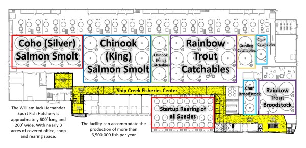 With over 100 rearing tanks, there is space for production of more than 4 million sport fish each year. These fingerling (1" to 2"), smolt (3" to 5") and catchable (7" to 12") fish are released throughout South Central Alaska from Cordova to Kodiak, Homer, Kenai, Seward, Anchorage, Mat/Su and Talkeetna. Sport fishing activity supported through these fish releases accounts for over $20 million a year in economic impact on local communities. Currently the facility produces chinook (king) salmon, coho (silver) salmon, rainbow trout, and Arctic char. Over 200 lakes are stocked annually with fish produced in the William Jack hatchery.