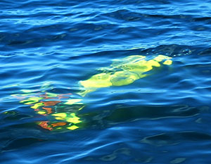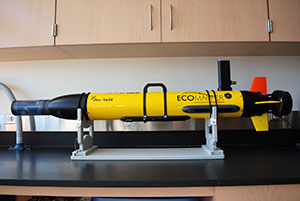 Weighing only 45 lbs, she is easily transported to her launch points and retrieved from her final destinations. Missions are first plotted on a geo-referenced image and then loaded onto the AUV’s onboard computer via its own wireless network. Missions can be safely run for 5 hours at a cruising speed of 2.5 knots. The antenna on top of the AUV houses a GPS unit that guides the AUV on its plotted course as long as she is not submerged underwater. On diving missions, which can reach depths as great as 200 feet, the AUV follows a compass heading to the next waypoint. Depth, temperature, dissolved oxygen, pH, chlorophyll, turbidity, and conductivity data are collected every second while the AUV sails on her mission. Various depth, gain, and frequency settings may be programmed for scanning sonar images. Upon completion of a mission, all data are easily downloaded over the same wireless network.