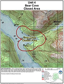 Area Description: Unit 4 Bear Cove Closed Area (Baranof Island): the area consists of all of Bear Cove in Silver Bay, from the mouth of the unnamed creek exiting Bear Lake, located approximately one-half mile southeast of BM "Virgo", along the coast to the point of land at BM "Ranus," including the entire shoreline of Bear Cove within one-fourth mile of the mean high tide line