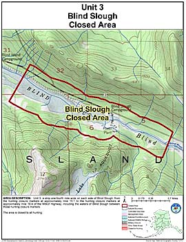 Area Description: Unit 3 Blind Slough Closed Area: the area consists of a strip one-fourth mile wide on each side of Blind Slough, from the hunting closure markers at approximately mile 15.1 to the hunting closure markers at approximately mile 18.4 of the Mitkof Highway, including the waters of Blind Slough between those hunting closure markers