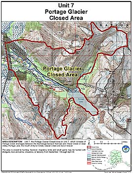 Area Description: Unit 7 the Portage Glacier Closed Area in Unit 7, which consists of Portage Creek drainages between the Anchorage-Seward Railroad and Placer Creek in Bear Valley, Portage Lake, the mouth of Byron Creek, Glacier Creek and Byron Glacier