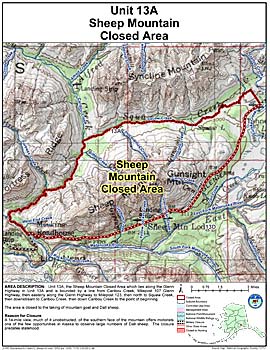 Area Description: Unit 13 the Sheep Mountain Closed Area which lies along the Glenn Highway in Unit 13(A) and is bounded by a line from Caribou Creek, Milepost 107 Glenn Highway, then easterly along the Glenn Highway to Milepost 123, then north to Squaw Creek, then downstream to Caribou Creek, then down Caribou Creek to the point of beginning