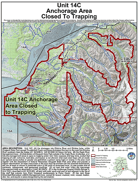 | Unit 14(C) Anchorage Area | 14C | Closed to the trapping of furbearers; additional restriction within area (C) listed above; killer style steel traps with an inside jaw spread seven inches or greater are prohibited: a person using traps or snares in the area must register with the Department of Natural Resources, Chugach State Park area office and provide a trapper identification; all traps and snares in the area must be marked with selected identification; the use of traps or snare is prohibited within (i) 50 yards of developed trails; (ii) one-quarter mile of trailheads, campground, and permanent dwellings |