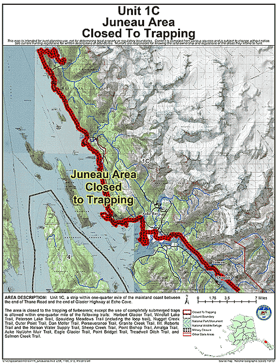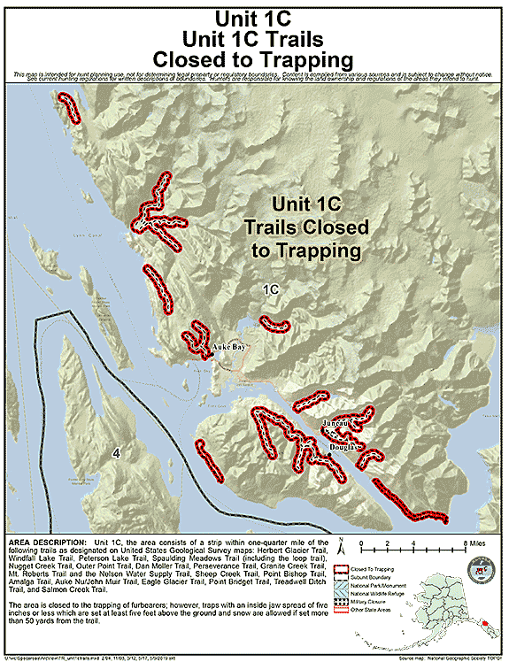 | Unit 1(C) Juneau Area | 01C | The area is closed to the trapping of furbearers; except the use of completely submerged traps is allowed within one-quarter mile of the following trails: Herbert Glacier Trail, Windfall Lake Trail, Peterson Lake Trail, Spaulding Meadows Trail (including the loop trail), Nugget Creek Trail, Outer Point Trail, Dan Moller Trail, |