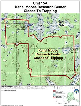 Area Description: The Kenai Moose Research Center Closed Area in Unit 15(A), which consists of that area within the outer boundary fences of the Kenai Moose Research Center, located west and south of Coyote and Vixen Lakes
