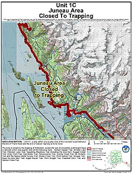 Restrictions: The area is closed to the trapping of furbearers; except the use of completely submerged traps is allowed within one-quarter mile of the following trails: Herbert Glacier Trail, Windfall Lake Trail, Peterson Lake Trail, Spaulding Meadows Trail (including the loop trail), Nugget Creek Trail, Outer Point Trail, Dan Moller Trail,