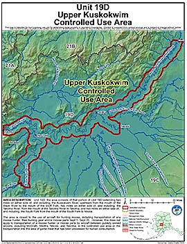 Area Description: Upper Kuskokwim Controlled Use Area: The area consists of that portion of Unit 19(D) extending two miles on either side of, and including the Kuskokwim River, upstream from the mouth of the Black River to the mouth of the Swift Fork, extending two miles on either side of, and including, the Takotna River, upstream from the mouth of the Takotna River to Takotna, and extending two miles on either side of, and including, the South Fork River, upstream from the mouth of the South Fork to Nikolai;
