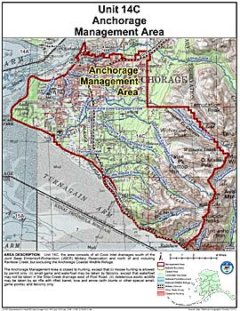 Area Description: The Anchorage Management Area: the area consists of all Cook Inlet drainages south of the Elmendorf and Fort Richardson military reservations and north of and including Rainbow Creek, but excluding the Anchorage Coastal Wildlife Refuge
