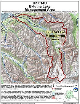 Area Description: The Eklutna Lake Management Area: the area consists of the drainages of Eklutna River and Eklutna Lake in Unit 14(C) upstream from the Glenn Highway, excluding those drainages flowing into the East Fork of Eklutna River upstream from the bridge above the Lake and Thunderbird Creek