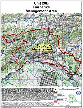 Area Description: Fairbanks Management Area: this area consists of that portion of Unit 20(B) bounded by a line from the confluence of Rosie Creek and the Tanana River, northerly along Rosie Creek to the middle fork of Rosie Creek through Section 26 to the Parks Highway, then east along the Parks Highway to Alder Creek, then upstream along Alder Creek to its confluence with Emma Creek, then upstream along Emma Creek to its headwaters, then northerly along the hydrographic divide between Goldstream Creek drainages and Cripple Creek drainages to the summit of Ester Dome, then down Sheep Creek to its confluence with Goldstream Creek, then easterly along Goldstream Creek to Sheep Creek Road, then north on Sheep Creek Road to Murphy Dome Road, then west on Murphy Dome Road to Old Murphy Dome Road, then east on Old Murphy Dome Road to the Elliot Highway, then south on the Elliot Highway to Davidson Ditch, then southeasterly along the Davidson Ditch to its confluence with the tributary to Goldstream Creek in Section 29, then downstream along the tributary to its confluence with Goldstream Creek, then in a straight line to First Chance Creek, then up First Chance Creek to the summit of Tungsten Hill, then southerly along Steele Creek to its intersection with the Trans-Alaska Pipeline right-of-way, then southeasterly along the easterly edge of the Trans-Alaska Pipeline right-of-way to the Chena River, then along the north bank of the Chena River to the Moose Creek dike, then southerly along the Moose Creek dike to its intersection with the Tanana River, and then westerly along the north bank of the Tanana River to the point of beginning