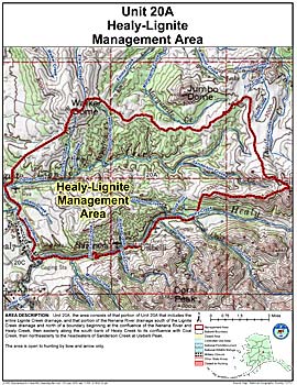 Area Description: Healy-Lignite Management Area: the area consists of that portion of Unit 20(A) that includes the entire Lignite Creek drainage, and that portion of the Nenana River drainage south of the Lignite Creek drainage and north of a boundary beginning at the confluence of the Nenana River and Healy Creek, then easterly along the south bank of Healy Creek to its confluence with Coal Creek, then northeasterly to the headwaters of Sanderson Creek at Usibelli Peak