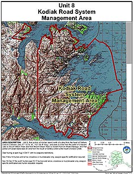 Area Description: Unit 8, Kodiak Island north of a line from the head of Settlers Cove to Crescent Lake (57°52'N, 152°58'W) including Peregrebni Peninsula, and east of a line from the outlet of Cresent Lake to Mount Ellison Peak and from Mount Ellison Peak to Pokati Point at Whale Passage, and that portion of Kodiak Island east of a line from the mouth of Saltery Creek to the mouth of Elbow Creek and adjacent small islands in Chiniak Bay