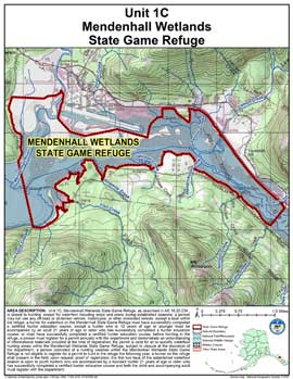 Restrictions: The area is closed to hunting, except for waterfowl including snipe and crane during established seasons; a person may not use any off-road or all-terrain vehicle, motorcycle, or other motorized vehicle, except a boat within the refuge; a hunter for waterfowl on the Mendenhall State Game Refuge must have successfully completed a certified hunter education course, except a hunter who is 12 years of age or younger must be accompanied by an adult 21 years of age or older who has successfully completed a certified hunter education course, or must have successfully completed a certified hunter education course; before hunting in the refuge, a person must register for a permit annually with the department and demonstrate an understanding of informational materials provided at the time of registration; the permit is valid for all or specific waterfowl hunting zones within the Mendenhall Wetlands State Game Refuge, subject to closure at the discretion of the department; a person convicted of a hunting violation within the Mendenhall Wetlands State Game Refuge is not eligible to register for a permit to hunt in the refuge the following year; a hunter on the refuge shall present in the field, upon request, proof of registration; the first two days of the established waterfowl season is open to youth hunters 17 years of age or younger who are accompanied by a licensed hunter 21 years of age or older who has successfully completed a certified hunter education course and both the child and accompanying adult must register with the department.