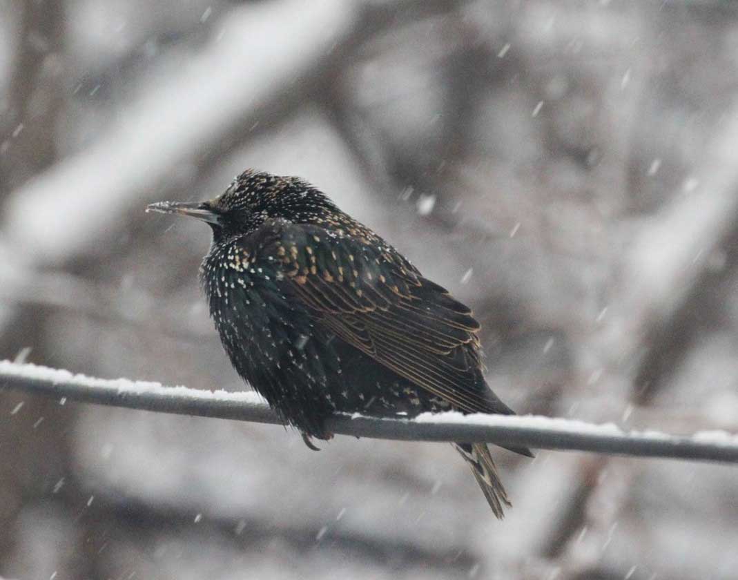 Also known as Common Starlings in Europe, adult birds are 8.4 in (21.3 cm) long with a 16.1 in (41 cm) wingspan and weigh 2.9 oz (82 g). They are similar in size to an American Robin but have iridescent dark feathers speckled in "starry" white flecks in winter and more uniformly dark in summer. Heads and feathers can have purple and greenish hues with pale orange legs and bright yellow beaks in breeding season. Females and males look identical, and juveniles are more brown with duller beaks.