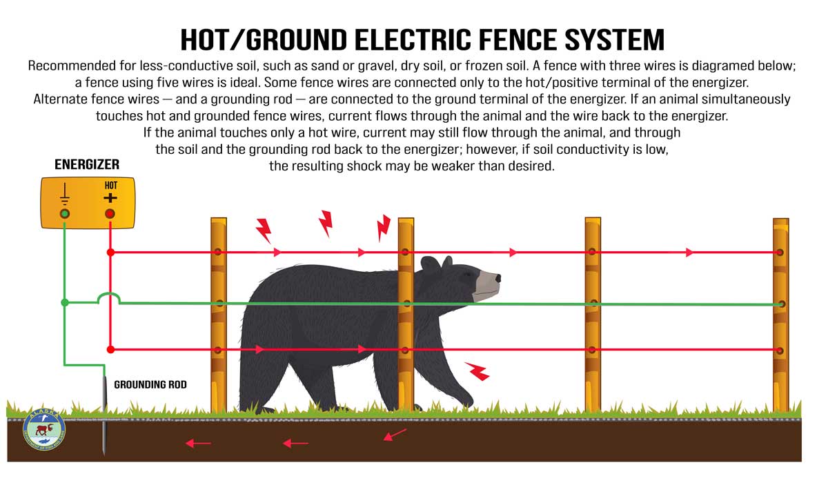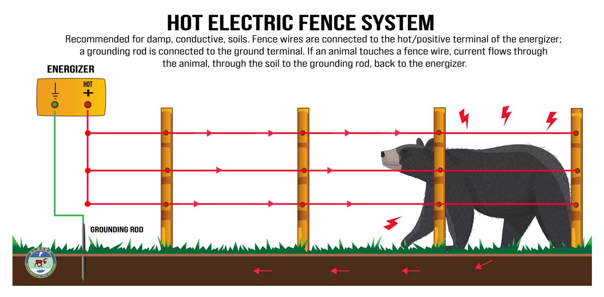 Electric fences have three main parts. When used properly all three components create an open circuit, which closes when touched by a bear.