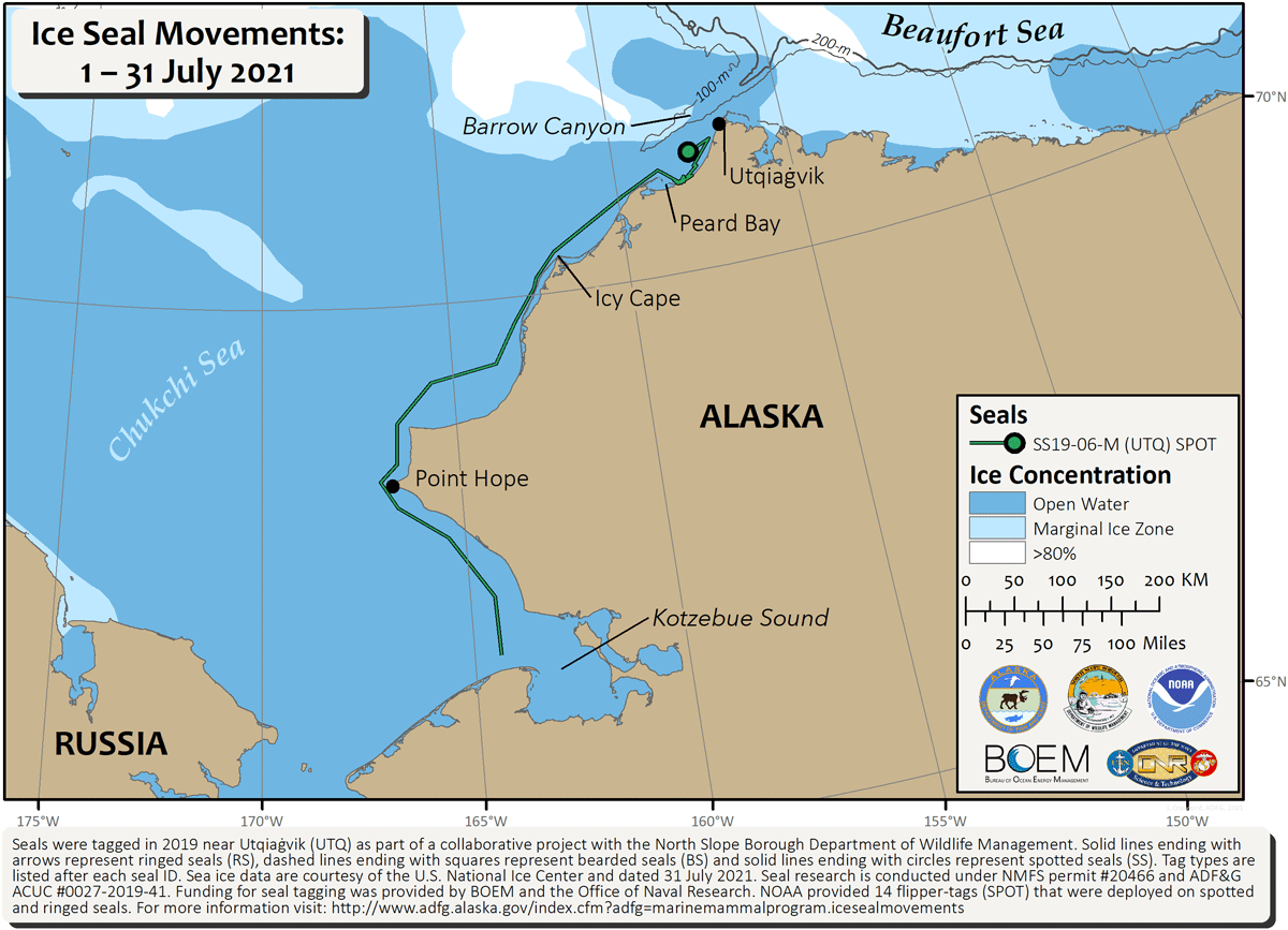 This seal was tagged during the fall of 2019 near Utqiaġvik, Alaska. As expected, the primary tag we epoxied to its back has since fallen off during the annual spring molt (2020). The locations we are currently receiving are from the SPOT tags we attached to its flipper. Because SPOT tags are attached to their flippers we only receive locations when the seal has hauled out of the water, either on sea ice or land. Seal movements can also be viewed on the Animal Telemetry Network (https://portal.atn.ioos.us/##metadata/ae1ea78a-2dbf-4294-908c-77580f92d5fd/project). Sea ice data are courtesy of the U.S. National Ice Center, dated 31 July 2021 (https://usicecenter.gov/Products/ArcticData).