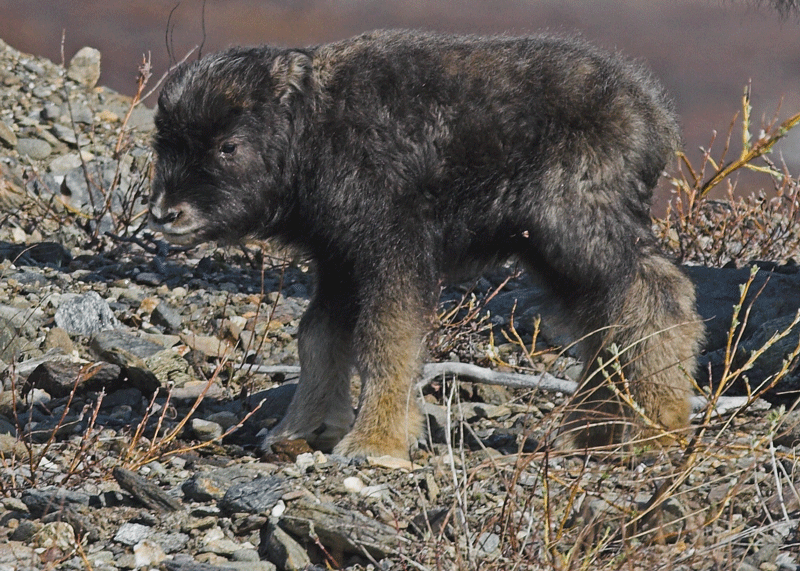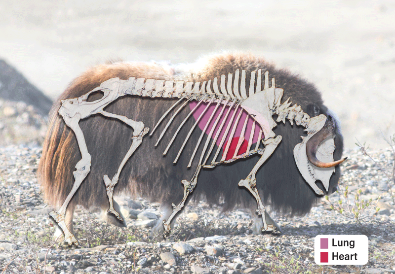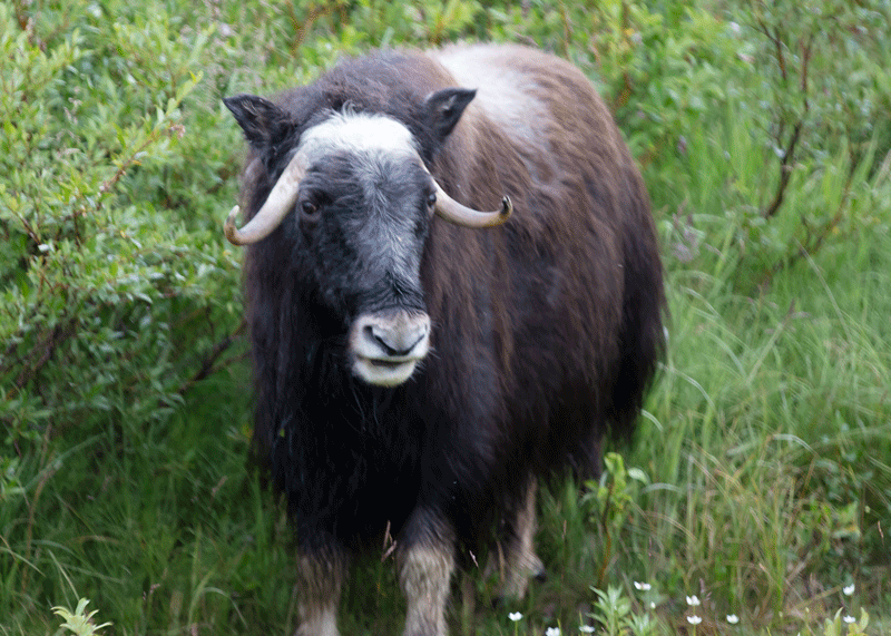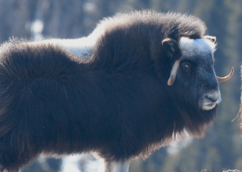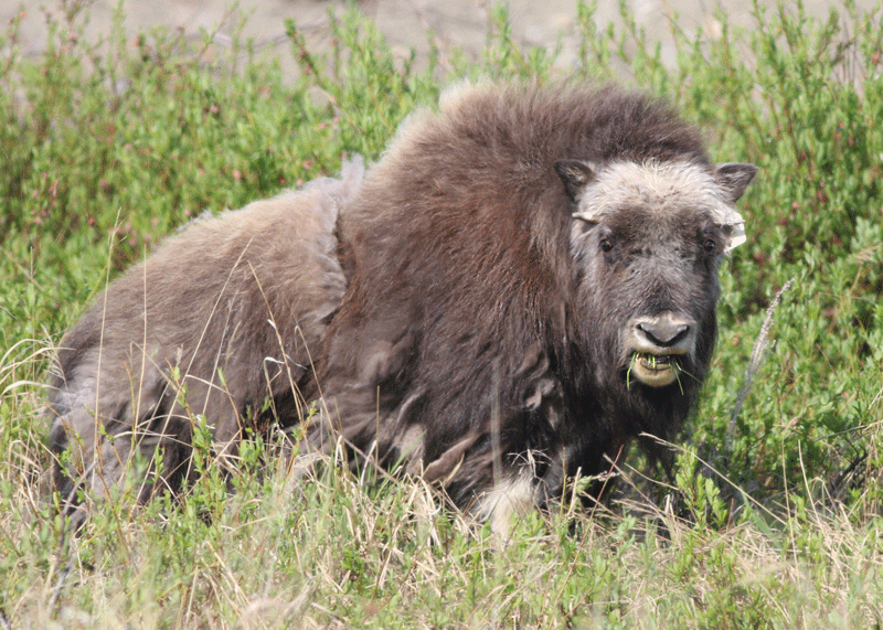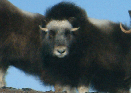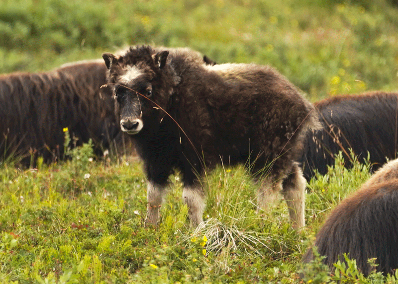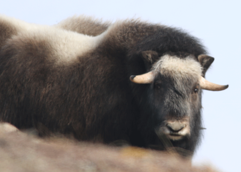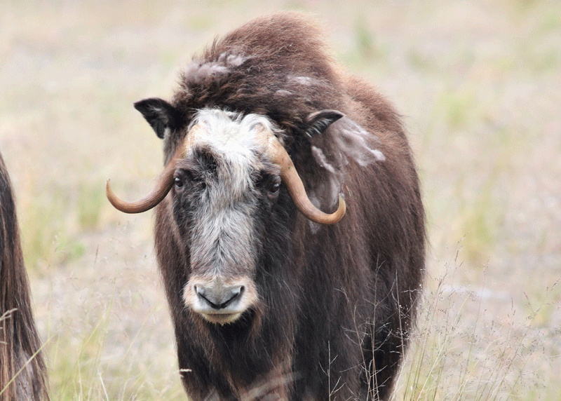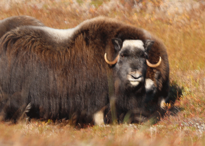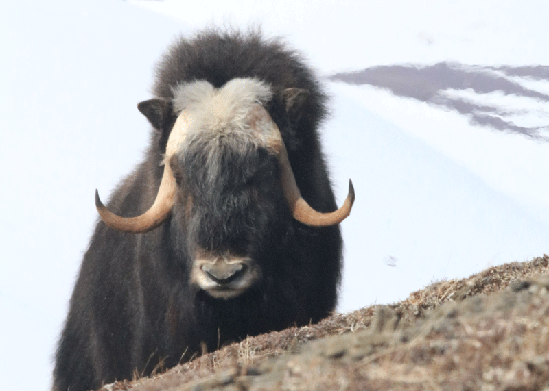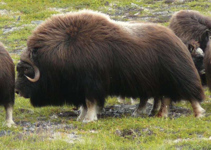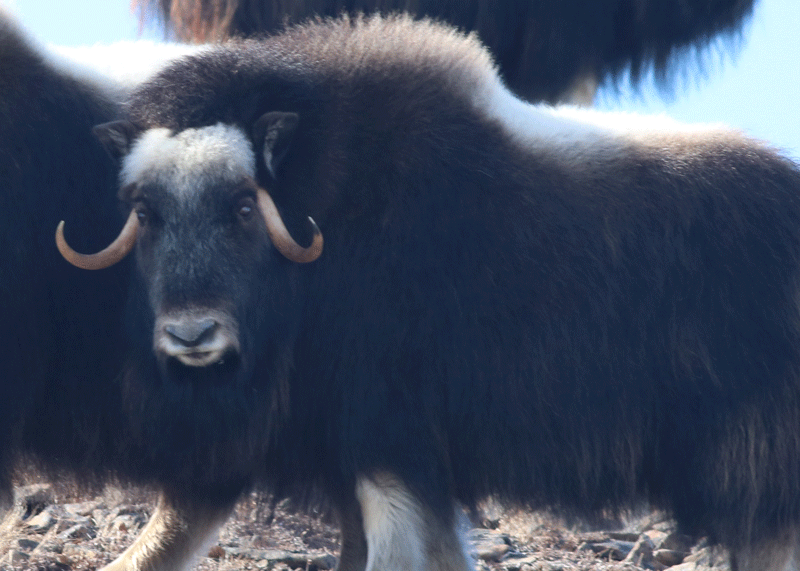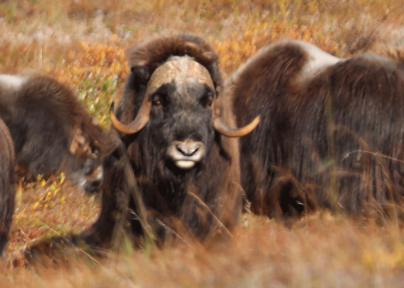 Study the photos in the id section and take the online muskox identification quiz. If harvesting a bull, we recommend hunting an all-bull group of muskox and not a mixed-sex group. After the first shot, the targeted muskox may walk back into the group. By taking your time and waiting-out the injured animal, you will avoid the unnecessary risk of wounding other animals. Smaller animals are commonly hidden behind larger animals. Be sure to look for extra legs before shooting. Look closely at the photo below.